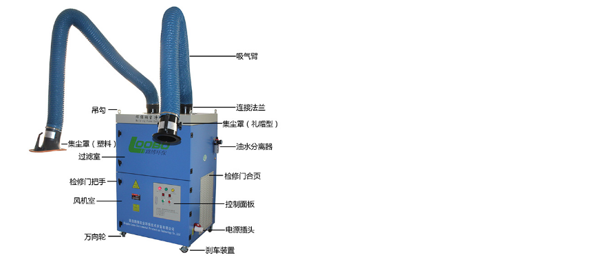 主要部件包括:萬向吸塵臂、耐高溫吸塵軟管、吸塵罩(帶風量調節(jié)閥)、阻火網(wǎng)、阻燃高效濾芯、脈沖反吹裝置、脈沖電磁閥、壓差表、潔凈室、活性碳過濾器、沉灰抽屜組合、阻燃吸音棉、帶剎車的新韓式腳輪、風機、進口電機以及電控箱等。