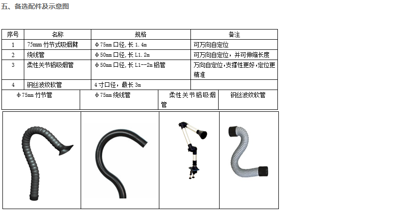 ◆機器可配萬向吸煙臂,可隨意變向、自定位(長度可根據(jù)客戶要求定制)。也可接軟管。端部裝以大型集煙罩,吸煙范圍廣闊。